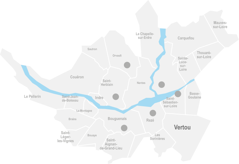 Saint Jean de Boiseau Le Pellerin Couëron Sautron Orvault Nantes La chapelle sur-Erdre Carquefou Mauves sur Loire Thouaré sur Loire Sainte Luce sur Loire Basse Goulaine Saint Sébastien sur Loire Vertou Les Sorinières Rezé Bouguenais Saint Aignan de Grand Lieu Bouaye Saint Léger les Vignes Brains Saint Herblain Indre La Montagne